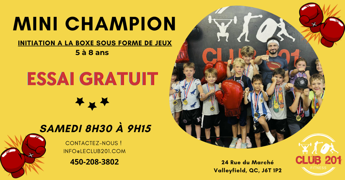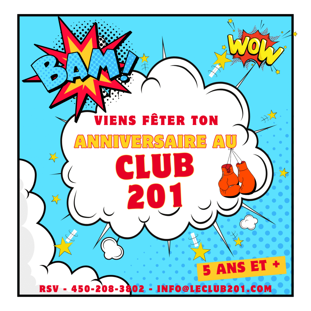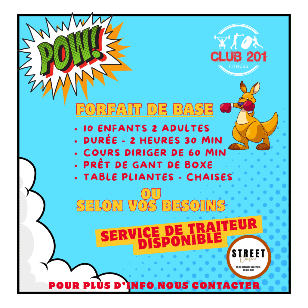 Prêt de gant et de bandage pour l’anniversaire et viens avec une passe d’essai gratuit au Club 201. Possibilité d’ajout selon vos besoins. Service de traiteur (Street Cuisine) selon vos besoins, médailles des champions et bien plus…